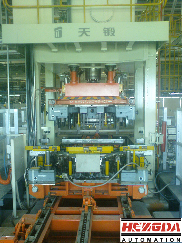 ②一臺機器帶一個雙工位換模小車的結構,換模小車在機器后側左右移動實現模具更換,在機器的左右側或前側布置上下料機構。包邊液壓機的噸位小,臺面尺寸偏大,所以均采用雙活塞缸結構,以便均布液壓機的受力。為降低成本,在客戶沒有特別強調的情況下油缸及拉桿在技術協議中均取消鍛鋼的描述,而敘述為優質鋼材。包邊液壓機主要用于汽車四門兩蓋的門板的壓合工藝,噸位選擇一般為150-250噸,從我廠目前已生產的包邊機看,150噸、200噸的占所有產品份額的90%以上,其中又以200噸的居多,所以包邊液壓機的標準噸位定位200噸。汽車包邊模具的尺寸大部分在2000-2800mm之間,高度在500-1000mm之間,因此包邊壓機的工作臺有效尺寸按照3個檔次設置:3200*2800mm、3000*2600mm、2600*2400mm;包邊壓機的開口尺寸定為2000mm,行程1450mm,基本可以涵蓋所有包邊模具的使用。