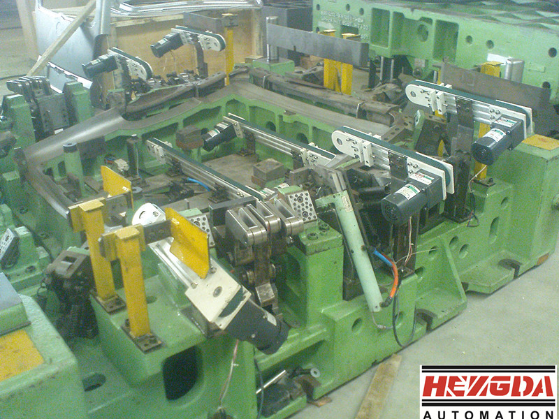 一種可切換式汽車門蓋包邊模輸送裝置,用于解決現(xiàn)有汽車門蓋包邊模輸送裝置輸送車型單一問題。其技術(shù)方案是:它包括機(jī)架和設(shè)置在機(jī)架上的左、右輸送帶機(jī)構(gòu),改進(jìn)后:左、右導(dǎo)向機(jī)構(gòu)分別包括滑軌、滑塊、導(dǎo)向座、導(dǎo)向板和氣缸,氣缸經(jīng)氣缸架與機(jī)架固定,氣缸桿連接滑塊,滑軌與機(jī)架固定,導(dǎo)向座固定在滑塊上,導(dǎo)向板固定在導(dǎo)向座上部,滑塊、滑軌滑動連接。本實(shí)用新型的左、右導(dǎo)向機(jī)構(gòu)間距可調(diào),因此可保證不同工件重心位置在兩輸送帶機(jī)構(gòu)中間;支撐輪設(shè)計(jì)可支撐車門窗框上側(cè),防止車門外板窗框處鈑金件在輸送過程中出現(xiàn)內(nèi)外板脫離現(xiàn)象。本實(shí)用新型可實(shí)現(xiàn)多車型門蓋輸送,有利于降低工裝成本,提高生產(chǎn)效率。